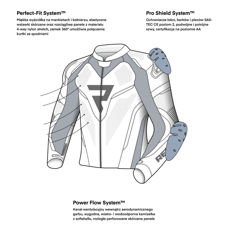 Kurtka motocyklowa skórzana Rebelhorn Rebel Lady ma komplet ochraniaczy SAS-TEC®. Newralgiczne miejsca zostały podszyte Kevlarem. Krój Rebelhorn Rebel podkreśla kobiecą sylwetkę. Kurtkę można spiąć ze spodniami z tej samej serii, tworząc w ten sposób dwuczęściowy skórzany kombinezon.