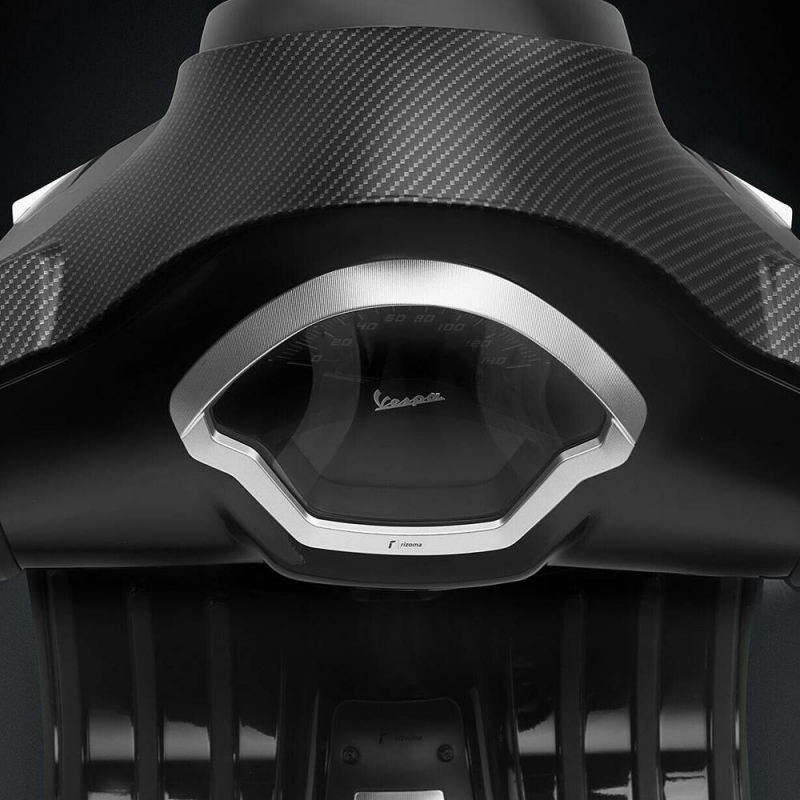 The Rizoma dashboard cover for Vespa is made from billet aluminium, finished through precision 3D machining and anodizing. Its lines are minimal, essential and the design features a raised border to protect the dashboard glass from excessive light or reflections.