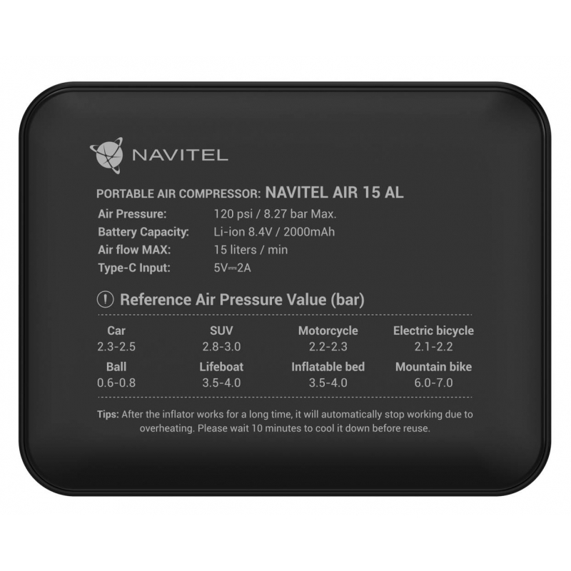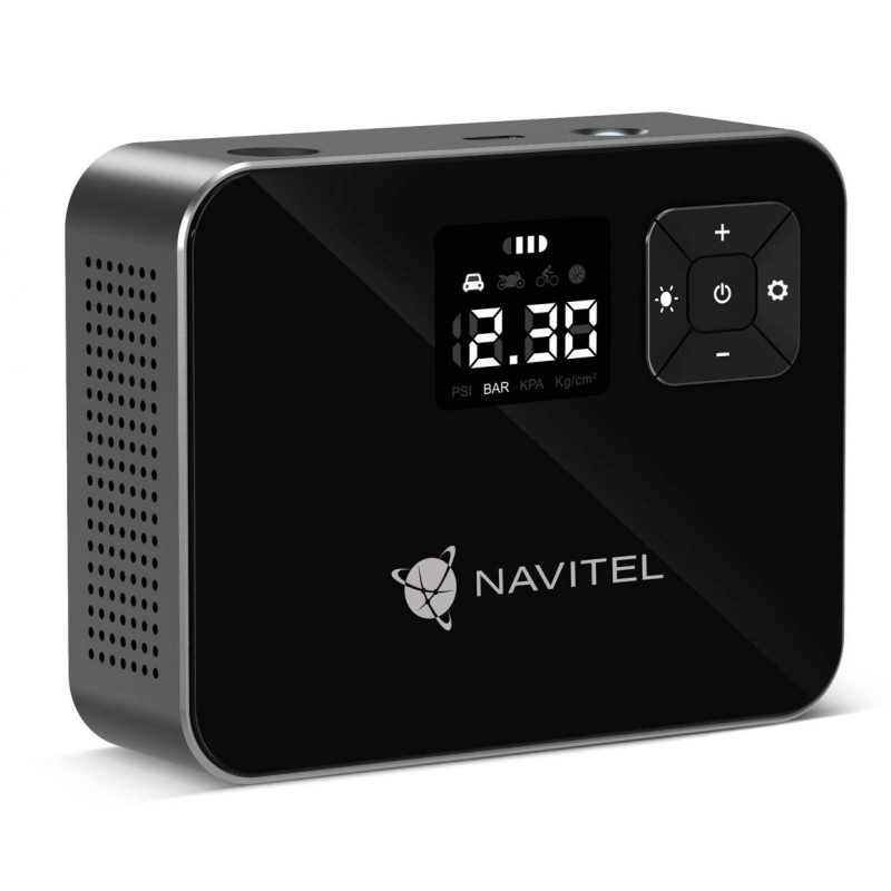 NAVITEL AIR 15 AL е захранван с батерии въздушен компресор с автоматичен регулатор на налягането, цифров манометър и LCD дисплей. AIR 15 AL ви позволява лесно да напомпате колелата на мотоциклет, кола, велосипед, топка или играчка за плуване. Благодарение на вградената литиево-йонна батерия с капацитет 2000 mAh, компресорът работи автономно – без необходимост от свързване към електрически контакт или към бордовата мрежа на автомобила.