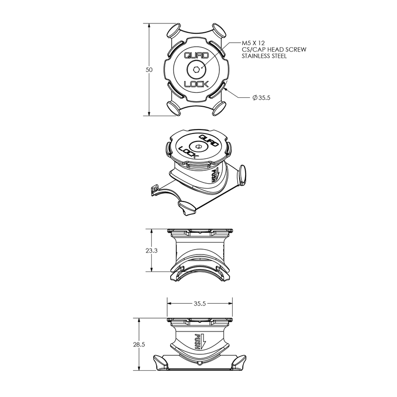At just 23mm tall and 35mm wide, the Quad Lock® Bike Mount fits seamlessly onto the stem or handlebar of your bike.