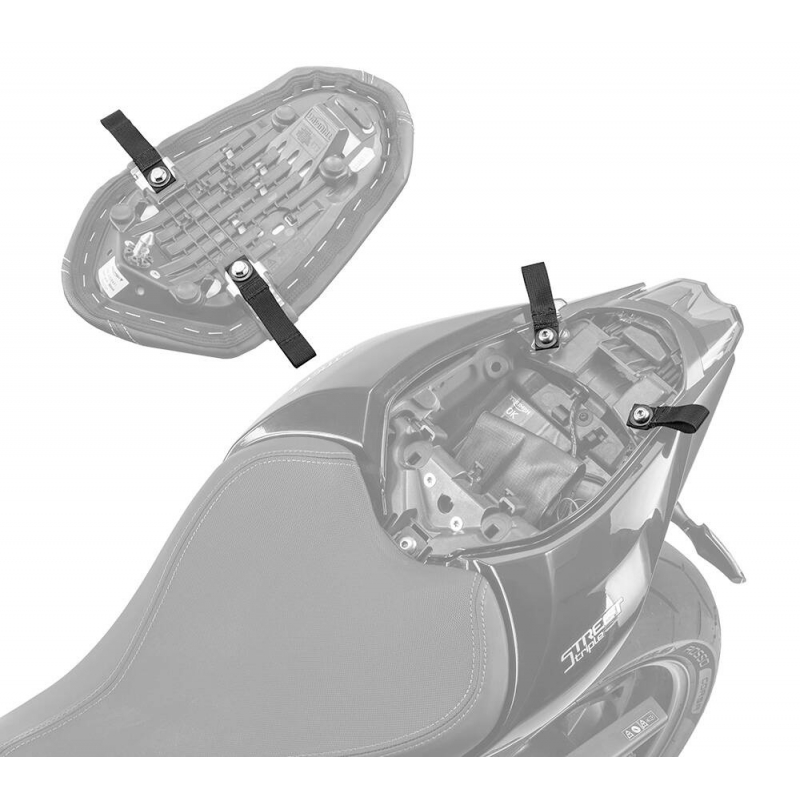 The kit consists of high quality hypalon & nylon webbing loops, that easily fit under the pillion seat using the existing mounting locations.