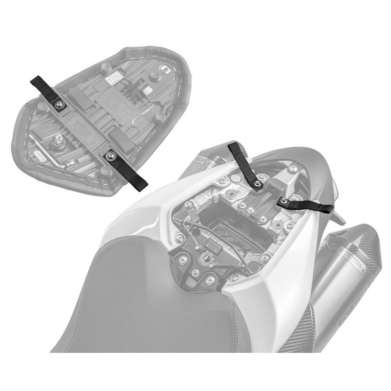 The kit consists of high quality hypalon & nylon webbing loops, that easily fit under the pillion seat using the existing mounting locations.