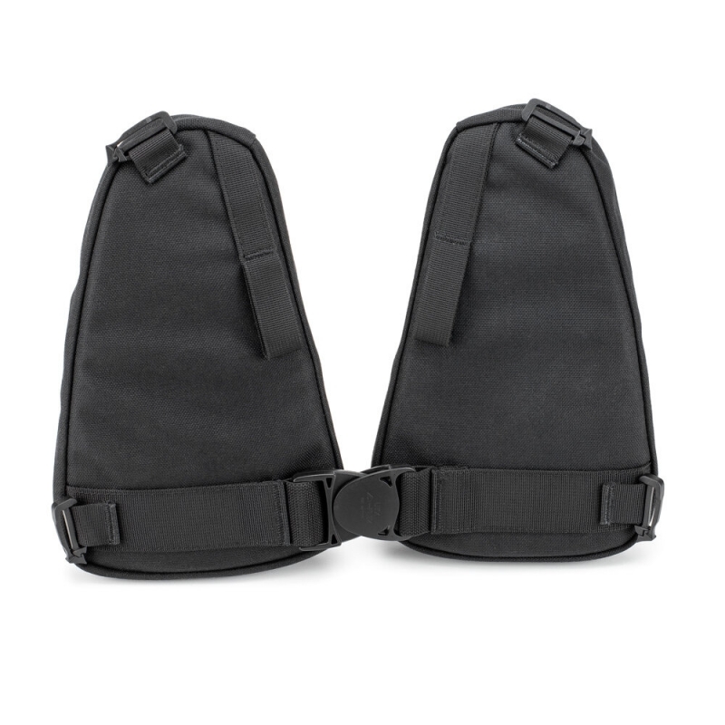 The pockets securely attach to each side of the harness with loops and locking clips and include an extra harness buckle for improved pack stability and weight distribution.