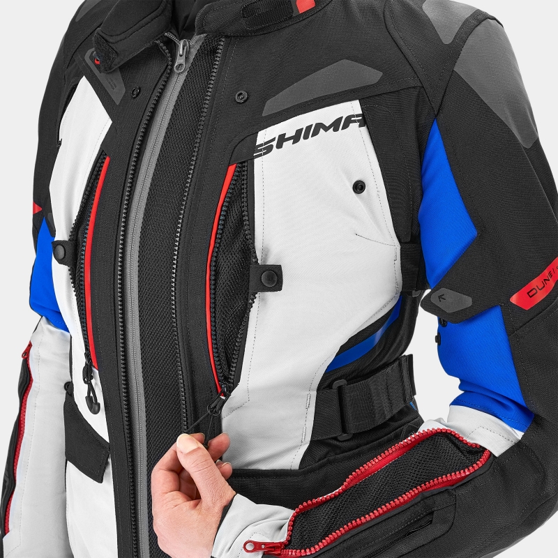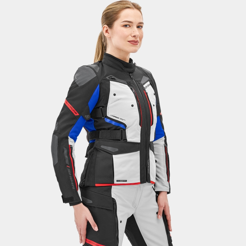 SHIMA DUNE LADY to idealne rozwiązanie dla motocyklistek, które cenią sobie połączenie funkcjonalności, bezpieczeństwa i stylu podczas każdego wypadu za miasto. Zaprojektowana z myślą o zmiennych warunkach, zapewnia niezawodność na każdej trasie. Wyraziste wersje kolorystyczne i system paneli odblaskowych Night Vision™ pozwalają dopasować kurtkę do własnych preferencji i zachować wysoki poziom bezpieczeństwa pasywnego podczas jazdy po zmroku. Kurtka motocyklowa SHIMA DUNE LADY oferuje doskonałe dopasowanie dzięki konstrukcji Lady Fit, zapewniając wygodę i swobodę ruchów. Trójwarstwowa budowa, składająca się z warstwy właściwej, wodoodpornej membrany NextDry™ oraz kamizelki ocieplającej, umożliwia dostosowanie kurtki do zmiennych warunków pogodowych. System H3 Pro™ pozwala na łatwe zwiększenie przepływu powietrza, a liczne panele wentylacyjne na klatce piersiowej, plecach i przedramionach zapewniają skuteczną wentylację w cieplejsze dni. Wykonana z tkaniny wzmocnionej materiałem typu ripstop, zwiększa odporność na rozdarcia i przetarcia, a technologia DuoLayer Protection™ oraz protektory pleców, barków i łokci poziomu 2 gwarantują zaawansowaną ochronę. Aby stworzyć kompletny zestaw na weekendowe wypady, możesz dokupić spodnie z serii DUNE LADY, które idealnie komponują się z kurtką. Kurtka SHIMA DUNE LADY, dostępna w rozmiarach XS-3XL oraz trzech wyrazistych kolorach: BLACK, FLUO, RED i BLUE.