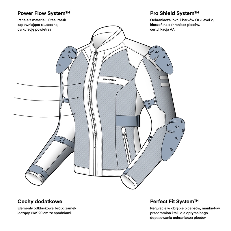 - Regulacja dopasowania: biceps (paski), mankiety, przedramiona (paski), talia (dla lepszego dopasowania ochraniacza pleców).