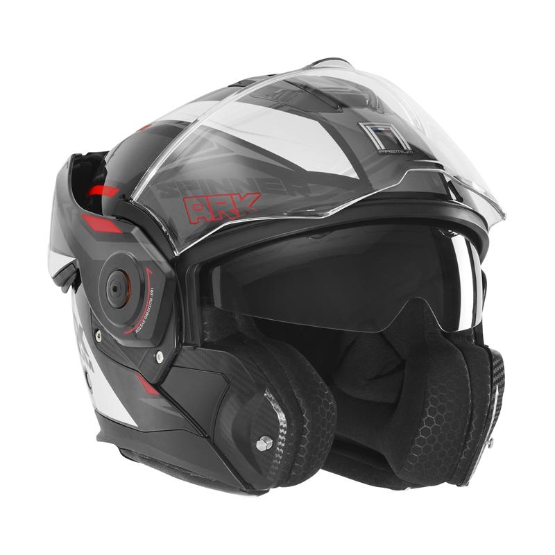 NOX PREMIUM KASK SZCZĘKOWY FLIP-BACK (SZCZĘKA DO TYŁU) Z BLENDĄ SPINNER ARK KOLOR CZARNY/BIAŁY/CZERWONY ROZMIAR S